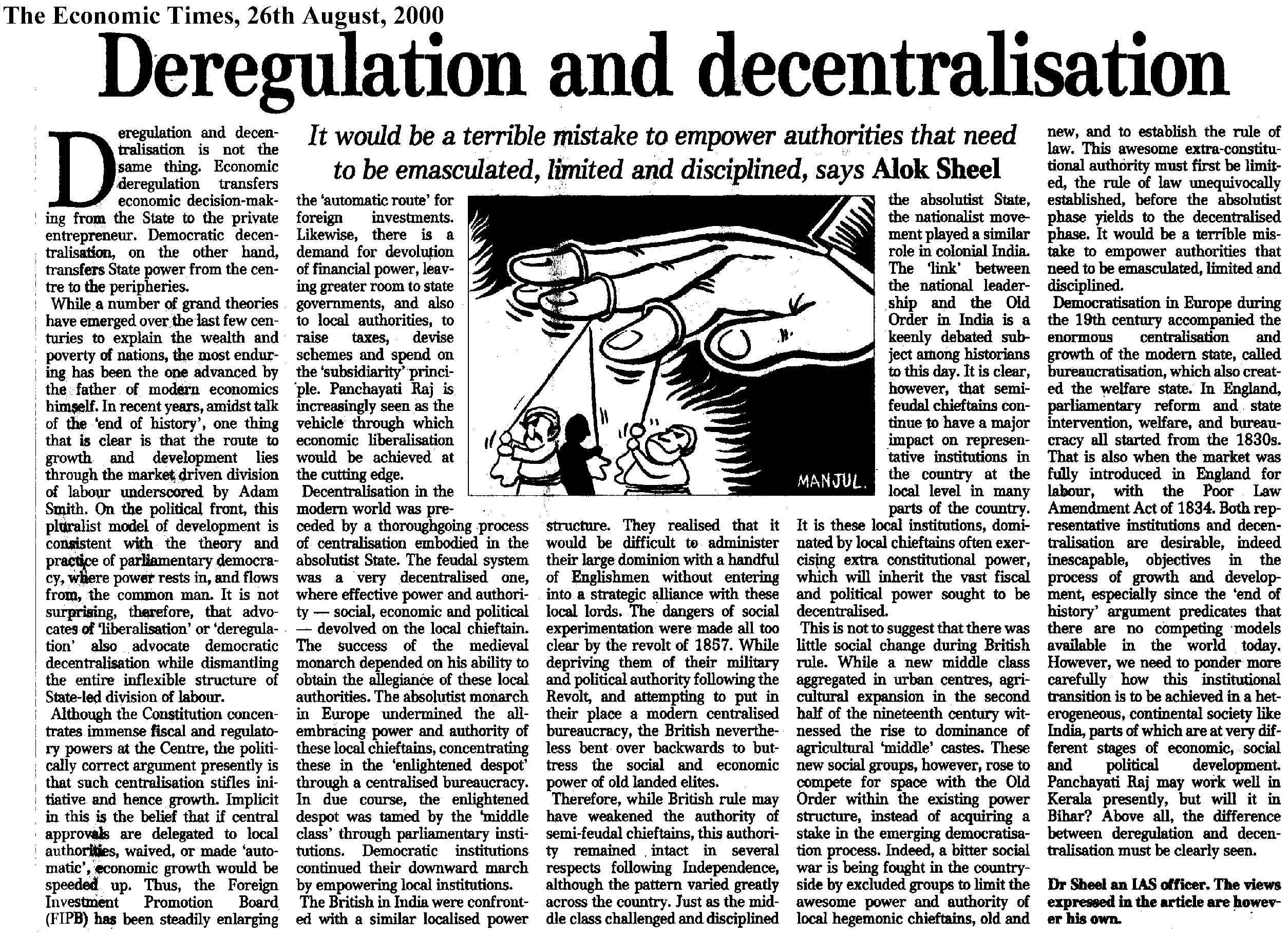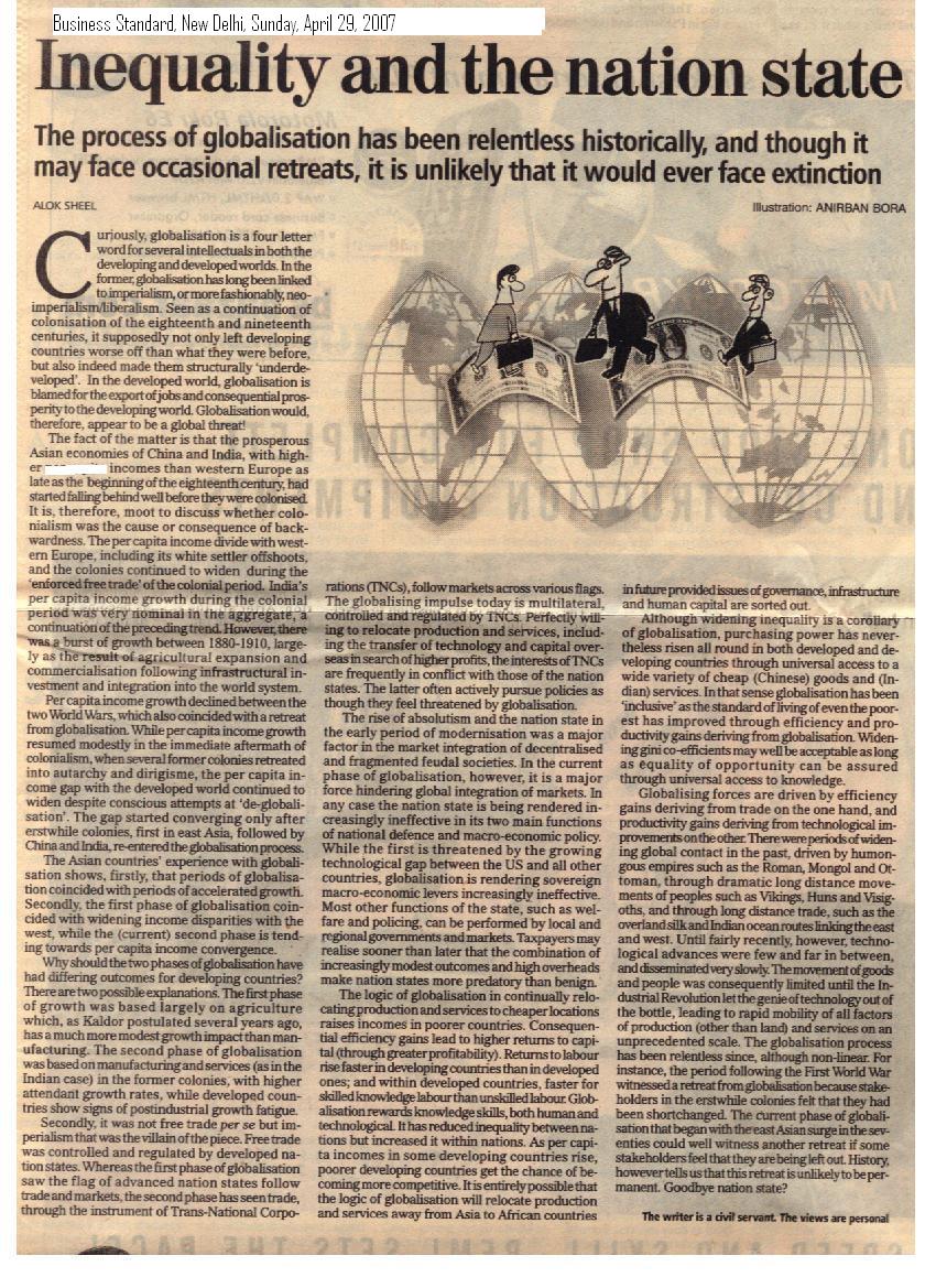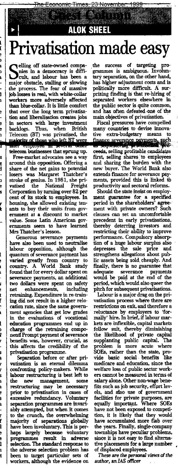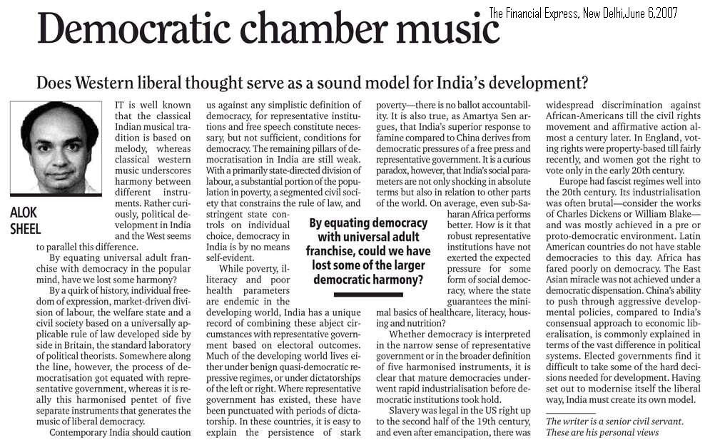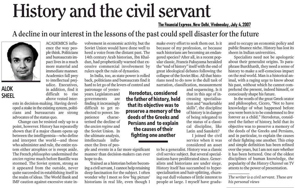 I have an abiding interest in the history of Modern India, and have published several articles and full-length book reviews in various academic journals, and have presented papers in a number of workshops and seminars both in India as well as abroad. In 1992 I was awarded the degree of Doctor of Philosophy (Ph.D) by the Jawaharlal Nehru University, New Delhi, for my thesis The Evolution of Agrarian Society in South Bihar: Shahabad and Gaya Districts 1860-1920. South Bihar is presently in a state of great social ferment. While not explicitly seeking to trace the origins of the present socio-economic crisis in the region, the Work nevertheless touches upon some it's historical antecedents. It is a regional historical study covering demographic trends, agricultural practices, technology and production, prices, trade and the rural social structure in the nineteenth and early twentieth centuries. The Work traces the deep impact wrought by British Rule in the Indian countryside, and also makes some comparisons with nineteenth century China and medieval Europe. Parts of my thesis have been published in academic journals. Contemporary history, which seeks to explain the present in terms of the past, is of special interest to me as this is where my training as a historian intersects with my profession as a civil servant. I have a flair for creative writing and am a regular contributor to the OpEd pages of financial dailies. I am currently working on full length books (non-fiction) that I hope to publish shortly.