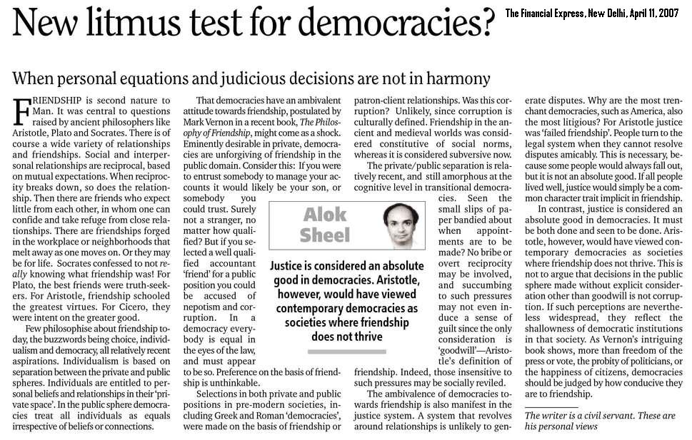 India is the world’s largest functioning democracy, with a unique record of practically uninterrupted free and fair elections for the last fifty years, i.e. ever since it attained Independence. These elections are organized through what is perhaps the biggest election machinery in the world, under the aegis of the Election Commission of India . During my earlier years in the civil service, I have acted as Returning Officer in these elections. I am now periodically drafted by the Election Commission to act as an independent “Observer” on its behalf to oversee the entire election process in particular constituencies to ensure its fairness.