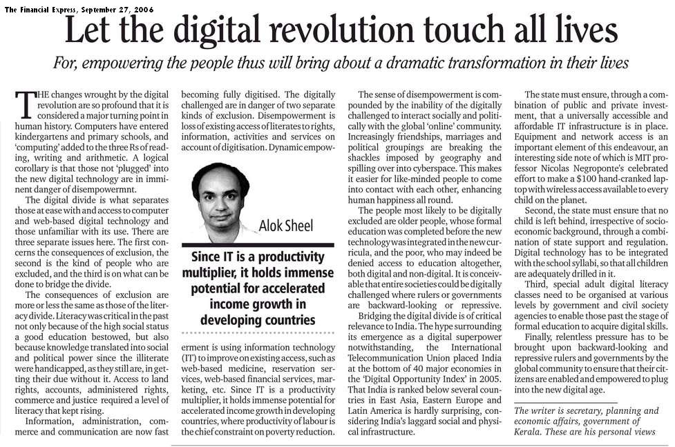 Following this, I worked for two years as Special Secretary, and subsequently, Secretary, Finance (Expenditure) to the Government of Kerala, a nodal post for controlling and managing the expenditures of the State Government, including evolving and issuing policy directives to all State government departments in this regard. It was my responsibility to control the quality and quantity of government expenditure, and to improve its efficacy. Thus I whetted all major public sector investment proposals. All cases relating to employment creation in government and public sector undertakings needed the concurrence of the Department of Expenditure. My post was a critical and nodal one under the State government, as files and expenditure proposals from all departments in government, including all major financial proposals emanating from autonomous institutions supported by government (such as schools, colleges, Financial Institutions, Public Sector Undertakings, etc.) were cleared by the Expenditure Department. In view of the tight financial position of the State, several financial powers earlier delegated by the Finance Department to various Administrative Departments had been withdrawn through economy orders issued from time to time, and the Department of Expenditure was responsible for issuing and implementing these economy orders. I was actively involved in policy making in areas such as controlling revenue deficits, resource mobilisation (especially small savings), debt management, including, inter alia, containing contingent liabilities in the form of State guarantees, financing the Public Sector, including Public Sector reform, determining and limiting the government’s exposure to the huge financial investments required for rapid development of the infrastructure -- especially Power -- sector, and the social sector.